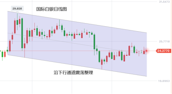 国际白银:国际白银趋势明显,自年内高位回落以来,整体走势形成一条下行通道,目前处于下行通道中轨线上方运行,在跌破这里之前,白银很可能在中轨上方震荡整理,直到价格触及通道上轨后,开始回落。支撑方面,关注目前通道中轨位置,即23.8美元附近,这也是目前布林带中轨位置;阻力方面,关注日线布林带上轨位置,即25.2美元附近。目前日线布林带缩口,国际白银预计收缩震荡整理。