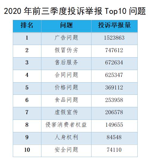 受整合后业务拓展和渠道扩宽影响,各类问题均较去年同期明显增加。广告问题排名居首,相关投诉举报共计152.38万件。其次为假冒伪劣、售后服务、合同、价格、食品、虚假宣传、侵害消费者权益等方面问题。
