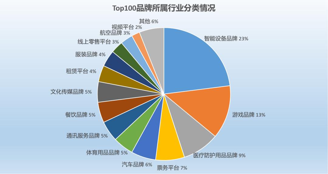 投诉举报涉及品牌54127个,同比下降0.95%;Top100品牌投诉举报量39.52万件,合计占比3.26%;Top100品牌中,智能设备类占比最高,为23%;其次为游戏类,占比为13%;共享单车、房地产、化妆品等类别占比约为1%。