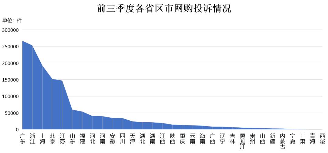 共计受理网购投诉举报146.72万件,占投诉举报受理总量31.85%,今年前三季度同比增长42.4%,主要集中在东部经济发达地区。