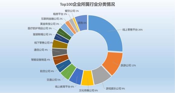 在投诉举报量居前100的企业中,线上零售公司占比最高,达到26%;其次为旅游公司,包含线下旅行社和线上旅游平台,占比12%。