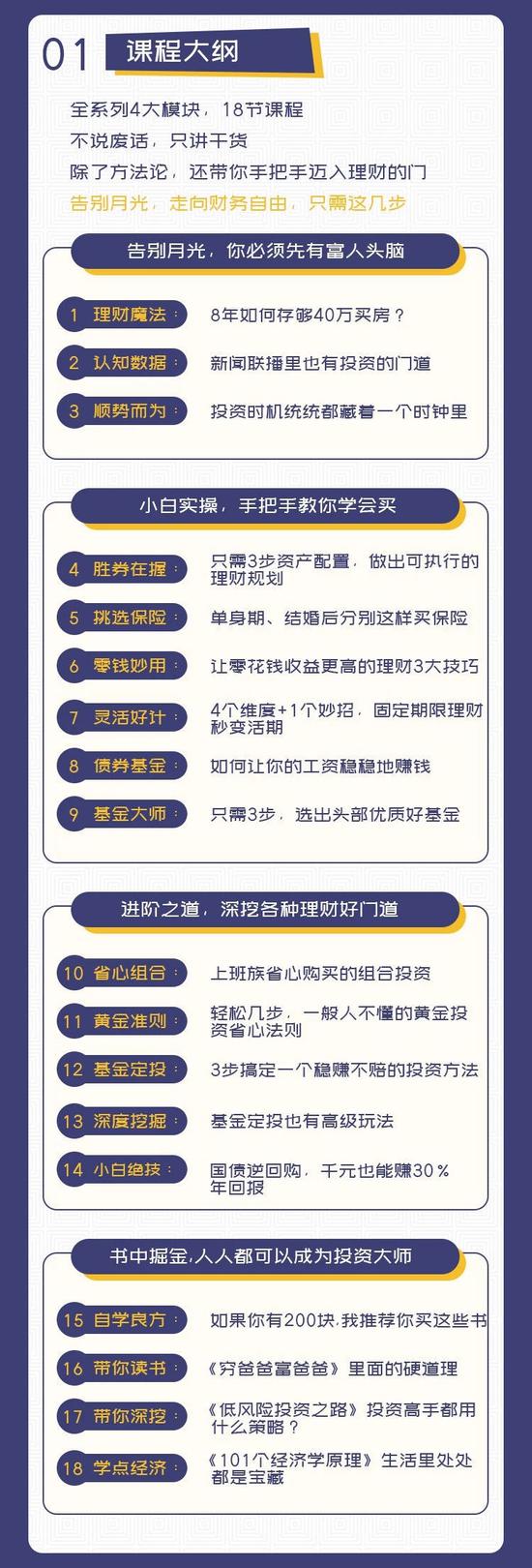 精心安排的内容:有理论基础也有实用方法,不留余地不讲废话,不仅把你领进门,也要让你学会做自己的理财顾问。