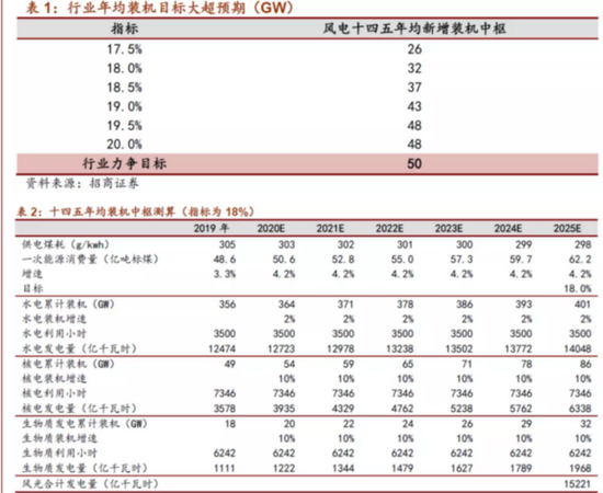 中银证券分析认为,在2020-2025年能源消费总量年均复合增长率3.5%、2025年非化石能源消费比例17.8%等保守预设条件下,测算2021-2025年(即“十四五”期间)光伏、风电合计新增装机空间约为425GW,年均新增85GW。比重提升对潜在装机提升明显:考虑2020年消费比重目标已提前完成,对消费比重更高的情况进行了测算,结果显示在非化石能源消费比重18%-20%的区间内,消费比重每提升0.5%,“十四五”期间光伏、风电年均装机总量约提升15GW。在19%比重的情况下,2021-2025年光伏、风电年均装机空间约122GW。