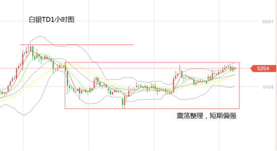 白银TD:白银近期震荡上涨,试图打破区间震荡。日内白银在5280元位置受阻小幅回落,这是昨日高点位置,也是今天到目前最高价位,若向上突破成功,上方空间将打开至5400元附近,下方支撑关注5200元附近,这是4小时5日均线位置,跌破这里之前,白银TD短期维持强势,其次关注4小时布林到中轨位置5140元,近期白银重要支撑就在布林带中轨。操作上,目前白银短期走势偏强,但回落有限,上方重要阻力位5280离现价较近,没有做多空间,建议观望,或者接近5280位置下方轻仓空一次。