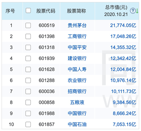 目前,A股市值最高的公司是2万亿元的消费龙头股:贵州茅台。工商银行、中国平安、建设银行、中国人寿、农业银行等金融股紧随其后,市值也超万亿元。