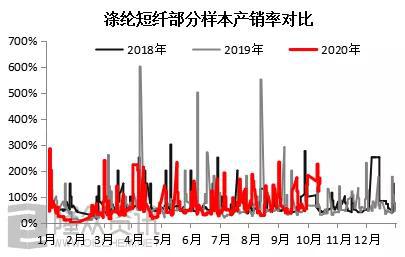库存方面,受部分海外订单回流以及终端订单阶段性好转影响,国庆假期前后涤纶短纤市场产销火爆,周均产销在169.1%。部分企业存在超卖现象,行业平均库存在-7.09天,较上一交易周期降幅高达200%。