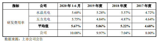 根据招股书中选取的同行业公司,上述同期,水晶光电的研发费用占比分别为4.72%、5.57%、5.28%和5.60%,五方光电的研发费用占比分别为4.64%、4.87%、4.84%和5.75%,可比公司研发费用率均值为4.68%、5.22%、5.06%和5.67%。