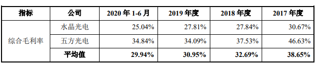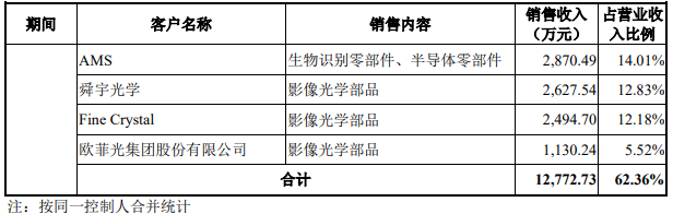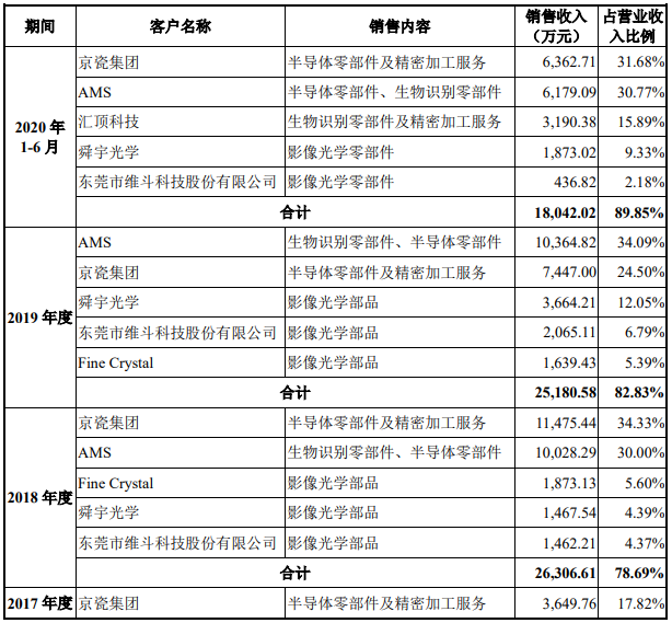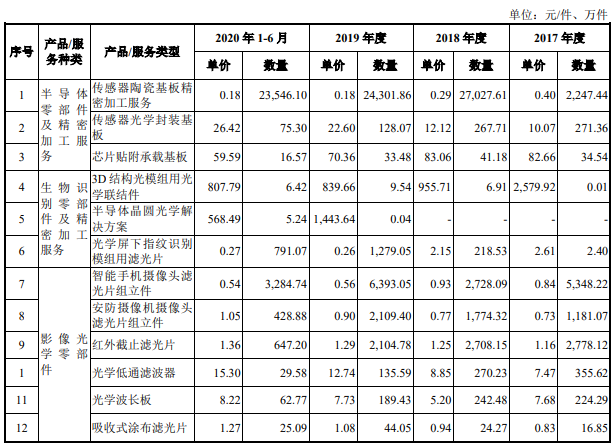 受到单价暴跌影响,上述产品的销售收入整体呈现下降趋势。2017年至2020年上半年,传感器陶瓷基板精密加工服务的销售收入分别为902.76万元、7945.10万元、4211.00万元和4162.07万元,3D结构光模组光学联结件的销售收入分别为21.74万元、7077.19万元、8420.19万元和8377.98万元,光学屏下指纹识别模组用滤光片的销售收入为6.26万元、469.25万元、336.72万元和211.97万元,智能手机摄像头滤光片组立件的销售收入为4495.04万元、2525.84万元、3580.52万元和1787.81万元。