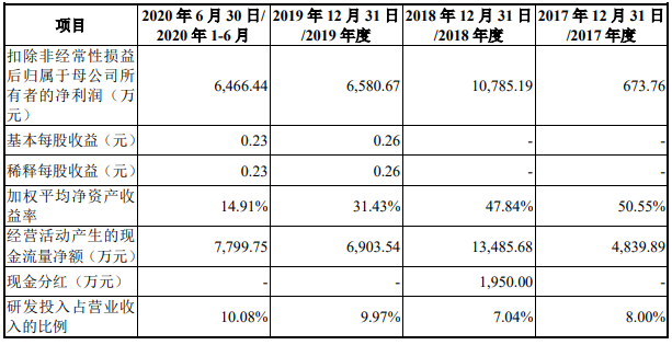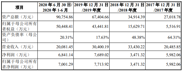 2017年至2020年上半年,美迪凯的营业收入分别为20,485.85万元、33,430.22万元、30,400.19万元和20,081.45万元,净利润分别为5982.06万元、3471.32万元、7689.02万元和6841.14万元。