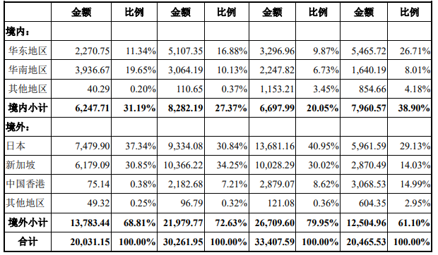 公司境外销售收入主要来自日本、新加坡等地。2017年至2020年上半年,美迪凯对日本、新加坡的销售总额分别为8832.08万元、2.37亿元、1.97亿元和1.37亿元。