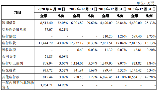2017年至2020年上半年各期末,公司的流动负债主要包括短期借款、应付账款、其他应付款等。