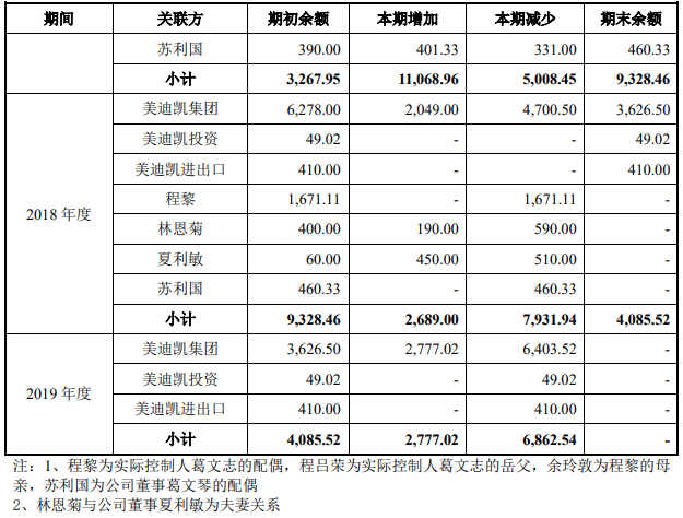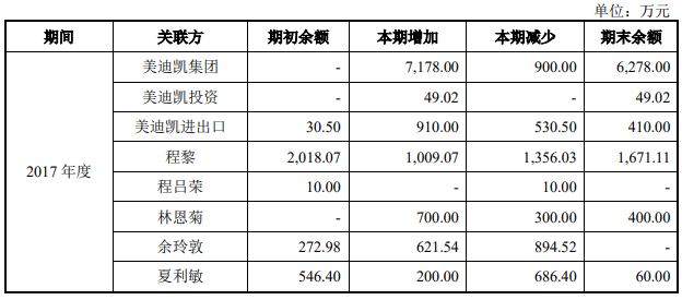 2017年、2018年,美迪凯向关联方拆入资金期末余额分别为9328.46万元、4085.52万元,拆入的关联方中包括公司实控人葛文志的配偶、岳父、岳母,以及董事葛文琴的配偶等。另外,美迪凯还存在“转贷”行为,2017年为满足贷款银行受托支付要求,美迪凯存在先将银行委托贷款支付给关联方台州思铭以及美迪凯进出口,然后对方将贷款返还的情况。