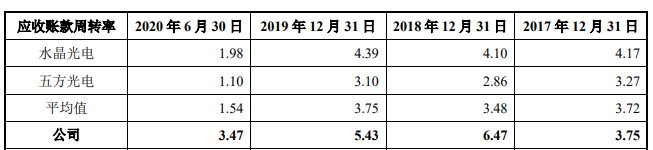 2017年至2020年上半年各期末,美迪凯的应收账款周转率分别为3.75次、6.47次、5.43次和3.47次,同行业可比公司平均值分别为3.72次、3.48次、3.75次和1.54次。