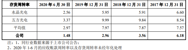 2017年至2020年上半年各期末,美迪凯的存货周转率分别为6.18次、3.56次、2.96次和1.48次,呈持续下滑态势。