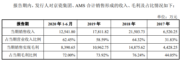 从美迪凯招股书披露的前五大客户来看,AMS和京瓷集团一直都是前两大客户,且美迪凯对这两家的销售收入占总营收比重不断增长,AMS从2017年的14.01%增长至2019年的34.09%,京瓷集团从2017年的17.82%增长至2019年的24.50%。