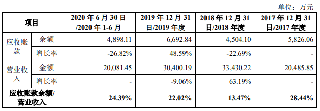2017年至2020年上半年各期末,美迪凯的应收账款余额分别为5826.06万元、4504.1万元、6692.84万元和4898.11万元,2018年、2019年、2020年上半年增速分别为-22.69%、48.59%和-26.82%。同期,公司应收账款余额占营业收入的比例分别为28.44%、13.47%、22.02%和24.39%。
