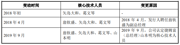 招股书显示,美迪凯的董监高及核心技术人员最近两年存在较多新增人员,公司的核心技术人员共4名,其中2名均为2018年、2019年新加入,而且核心技术人员中的山本明、矢岛大和均为日本国籍。