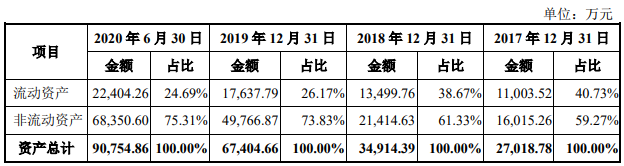 招股书披露,2017年至2020年上半年各期末,美迪凯总资产规模分别为27,018.78万元、34,914.39万元、67,404.66万元和90,754.86万元,流动资产分别为11,003.52万元、13,499.76万元、17,637.79万元和22,404.26万元。