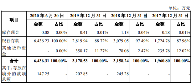 上述同期,公司的货币资金分别为1960.80万元、3158.24万元、3178.53万元和6436.31万元,其中主要是银行存款。
