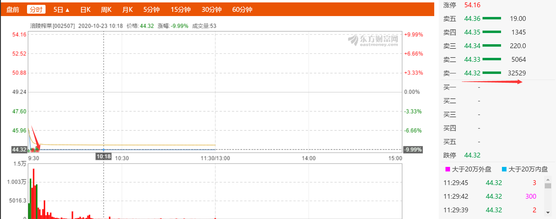 10月23日,业绩不及预期加之高位,部分牛股回调风险持续释放。涪陵榨菜早盘大幅低开,仅仅一分钟就被蜂拥而出的大额卖单砸死跌停板,一动也不动。