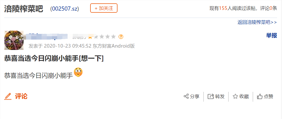 也有网友戏称:“恭喜当选今日闪崩小能手”。由于闪崩来得实在是太突然,有股友称“一早打开软件,懵了”。