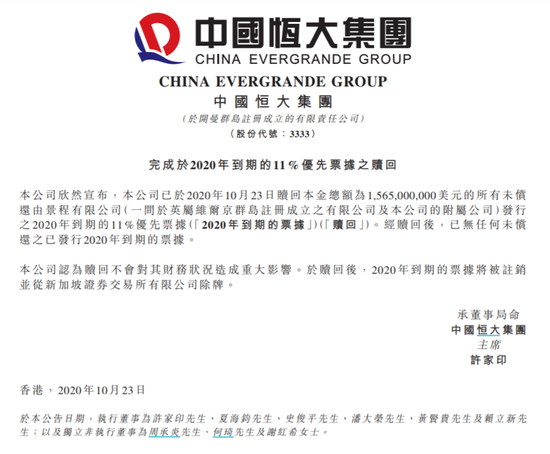 热点栏目10月23日消息,中国恒大在港交所公告,恒大已提前偿还15.65亿美元境外债,折合约121亿港元。经赎回后,已无任何未偿还之已发行2020年到期的票据。