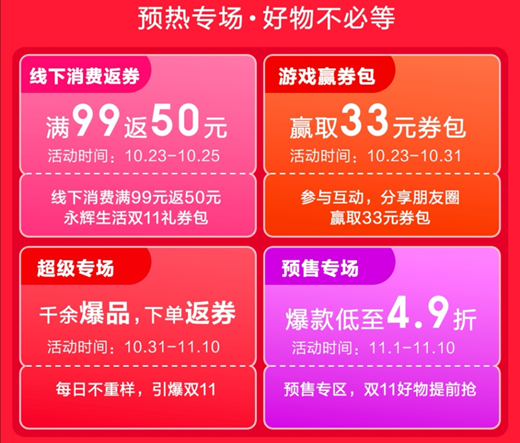 10.23-10.31预热第一波,千种商品抢先优惠,玩游戏赢券包。其中10月23-25日,线下内购会震撼开抢,活动期间一次性线下购物实付满99元可领取50元双11预热券包。