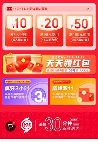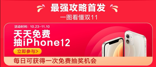 10.23-11.10预热期间,为了给用户更多惊喜,天天免费抽iPhone12贯穿整个活动期。天天来天天抽,会员每日即可免费获得1次抽奖机会,再次下单满48元可再获一次机会,抽奖机会可叠加,多买多抽。据透露,奖品池内有满减券、全年免费常温奶,更有万众期待的iPhone12。同时11.1-11.11天天领红包,完成互动任务赢取108元双11大礼包。