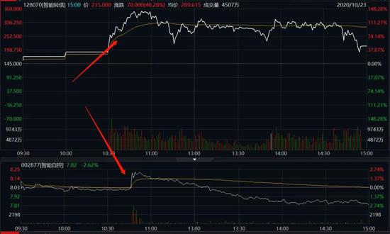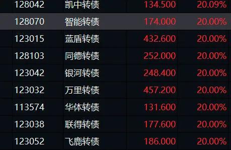 其中,“盘子”仅有2.3亿元的智能转债成为今日焦点。智能转债开盘触及20%熔断线,此后类似正元转债走势,一路冲破30%熔断线,并且持续上行。