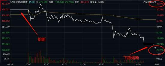 万里转债甚至出现了两个26.97%:一个是上涨熔断后的26.97%,一个是下跌熔断后的26.97%。