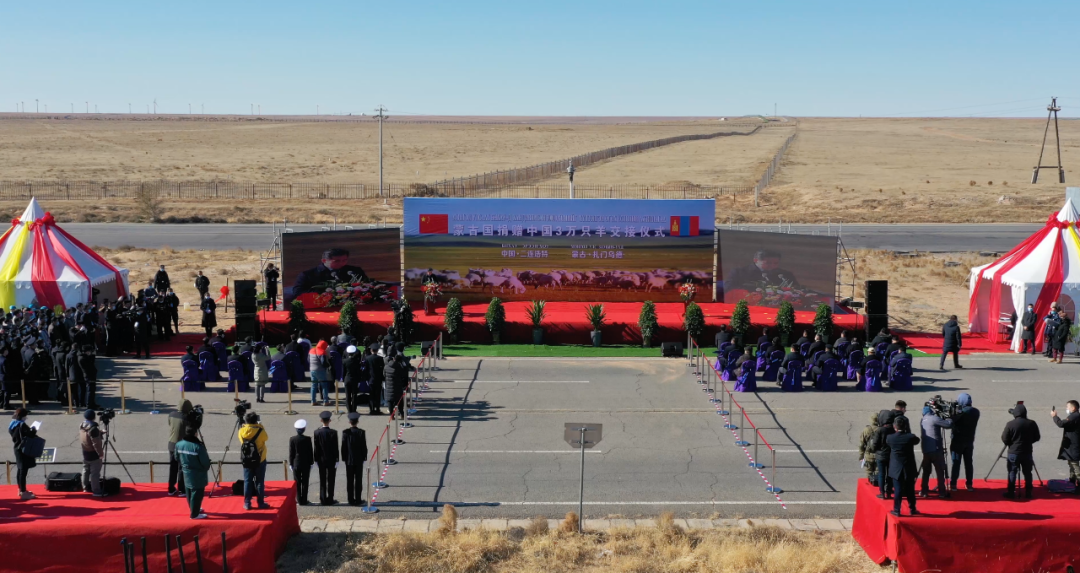 10月22日本周四一早,蒙古国向我国捐赠的首批四千只活羊,被分装上17辆货车,停靠在中蒙边境公路0公里处。就在此前一天,这些来自中蒙两国的货车,便在蒙古国扎门乌德口岸,被这份特殊时期的特殊赠礼所装满,等待着交接仪式的开始。