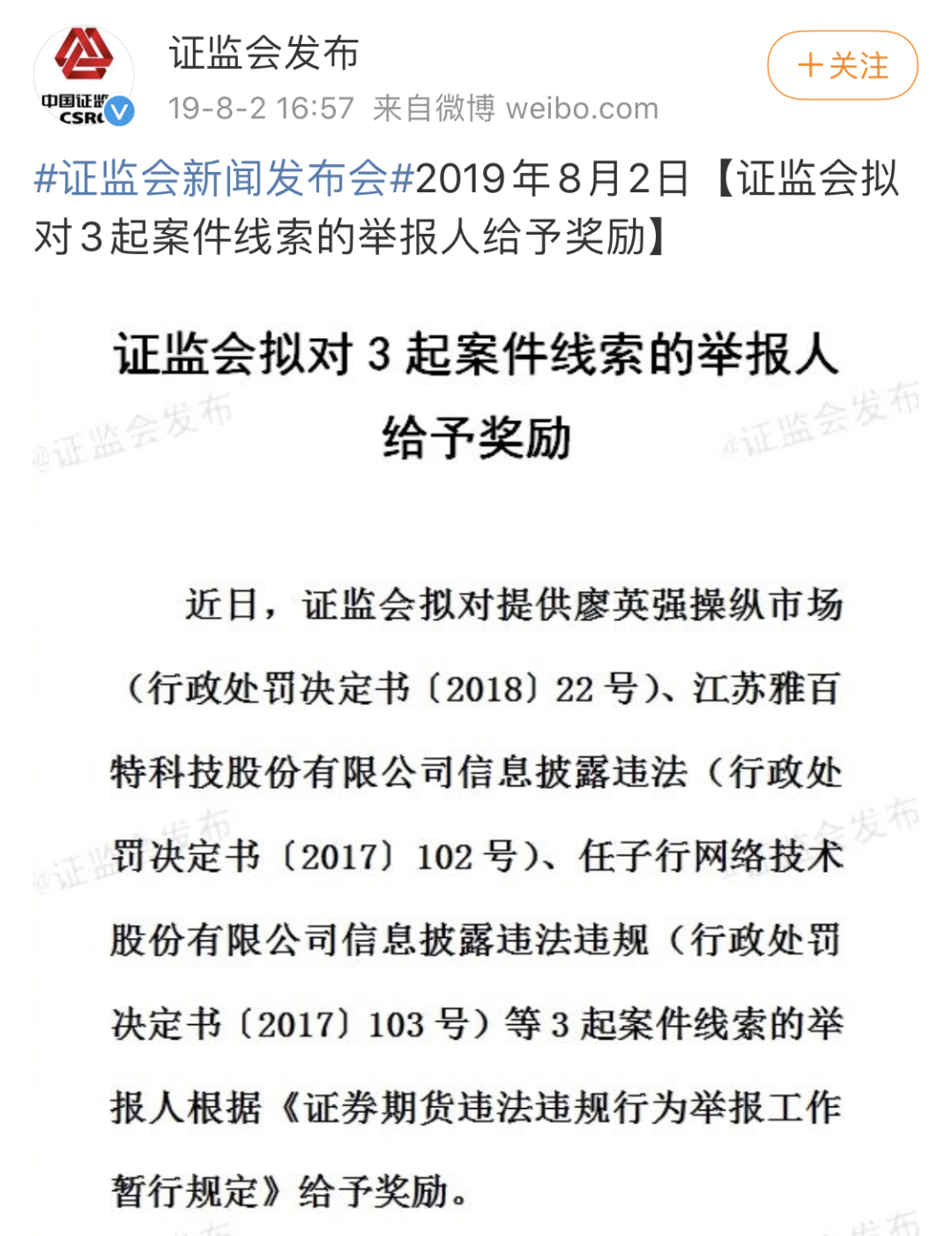 在A股市场,也有举报获奖的相关案例。2019年8月2日,证监会发布消息,拟对提3起案件线索的举报人给予奖励。