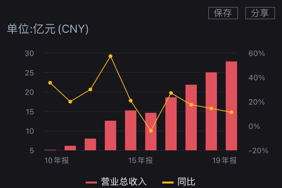 从更长时间段来看,香雪制药营业收入在不断增长。2015年至2019年营收分别为14.65亿元、18.62亿元、21.87亿元、25.04亿元、27.75亿元,增幅分别为-3.90%、27.4%、17.7%、14.2%、10.82%。