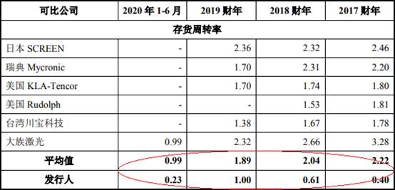 2017年至2020年1-6月,芯碁微装存货周转率分别为0.40次、0.61次、1.00次、0.23次,同行业可比上市公司存货周转率均值分别为2.22次、2.04次、1.89次、0.99次。