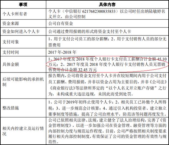 招股书显示,2017年度及2018年度,芯碁微装通过费用报销形式将资金支付至公司控制的以陆敏婷名义开立的个人银行卡中,用以支付部分员工薪酬及费用。2017年及2018年个人银行卡支付员工薪酬合计金额45.10万元;2017年及2018年个人银行卡支付销售人员无票销售费用合计金额32.45万元。公司于2019年初终止使用个人卡。