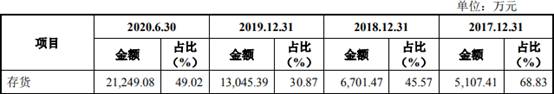 2017年至2020年1-6月,芯碁微装存货账面价值分别为5107.41万元、6701.47万元、1.30亿元、2.12亿元,占流动资产比例分别为68.83%、45.57%、30.87%、49.02%。