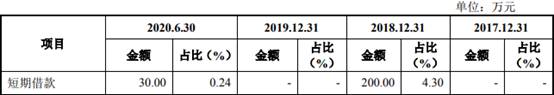 2018年、2020年1-6月,芯碁微装短期借款分别为200.00万元、30.00万元,占流动负债比例分别为4.30%、0.24%。