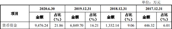 2017年至2020年1-6月,芯碁微装货币资金分别为446.32万元、1332.14万元、6849.70万元、9476.24万元,占流动资产比例分别为6.01%、9.06%、16.21%、21.86%。