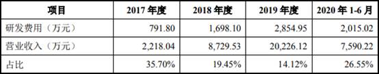 2017年至2020年1-6月,芯碁微装研发费用分别为791.80万元、1698.10万元、2854.95万元、2015.02万元,占营业收入比例分别为35.70%、19.45%、14.12%、26.55%。