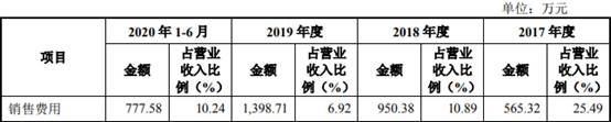 2017年至2020年1-6月,芯碁微装销售费用分别为565.32万元、950.38万元、1398.71万元、777.58万元,占营业收入比例分别为25.49%、10.89%、6.92%、10.24%。