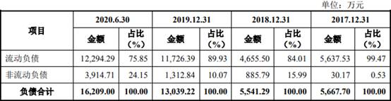 2017年至2020年1-6月,芯碁微装负债合计分别为5667.70万元、5541.29万元、1.30亿元、1.62亿元,其中,流动负债分别为5637.53万元、4655.50万元、1.17亿元、1.23亿元,非流动负债分别为30.17万元、885.79万元、1312.84万元、3914.71万元。