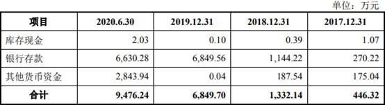 2017年至2020年1-6月,芯碁微装货币资金中库存现金分别为1.07万元、0.39万元、0.10万元、2.03万元,银行存款分别为270.22万元、1144.22万元、6849.56万元、6630.28万元,其他货币资金分别为175.04万元、187.54万元、0.04万元、2843.94万元。