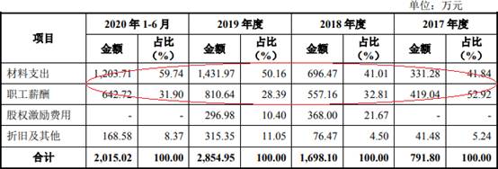 2017年至2020年1-6月,芯碁微装研发费用中材料支出分别为331.28万元、696.47万元、1431.97万元、1203.71万元,占比分别为41.84%、41.01%、50.16%、59.74%;职工薪酬分别为419.04万元、557.16万元、810.64万元、642.72万元,占比分别为52.92%、32.81%、28.39%、31.90%。