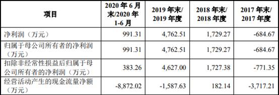 2017年至2020年1-6月,芯碁微装归母净利润分别为-684.67万元、1729.27万元、4762.51万元、991.31万元,经营活动产生的现金流量净额分别为-3717.21万元、182.14万元、-1587.63万元、-8872.02万元。