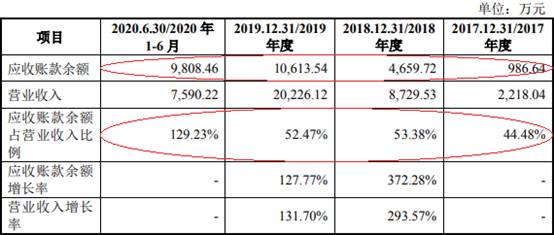 2017年至2020年1-6月,芯碁微装应收账款余额分别为986.64万元、4659.72万元、1.06亿元、9808.46万元,占营业收入比例分别为44.48%、53.38%、52.47%、129.23%。