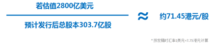 假设蚂蚁估值在2800亿美元,则预计每股约71.45港元,若与阿里巴巴回港上市时一样每手100股,则一手价格约为7145港元,加上手续费,入场费大约在7300港元左右,计算方式如下: