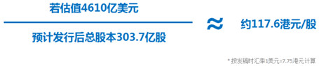 若蚂蚁估值在4610亿美元,预计每股约117.6港元,每手若为100股,则一手价格为11760港元,入场费大约在11900港元左右。综上看,蚂蚁入场费7300-11900港元左右。