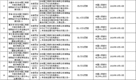 此外,时任工行湖南省分行内控合规部主要负责人杨爱华、工行湖南省分行个人金融业务部主要负责人李跃进等15位上述违法违规行为的相关责任人一并受罚,分别被人民银行长沙中支罚款1-2.5万元不等。