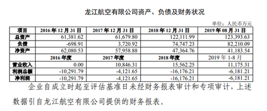 截至2019年8月31日,龙江航空的资产总额为12.34亿元,负债总额为8.22亿元,净资产额为4.12亿元。
