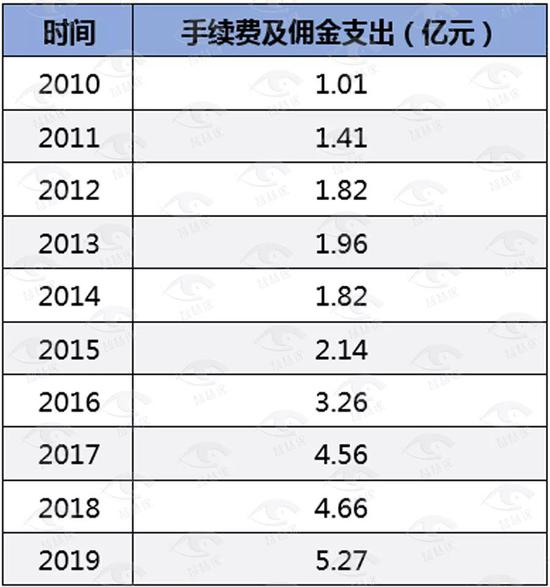 据统计,自2010年以来,中荷人寿手续费及佣金支出不断上升,在2019年更是达到5.27亿元。